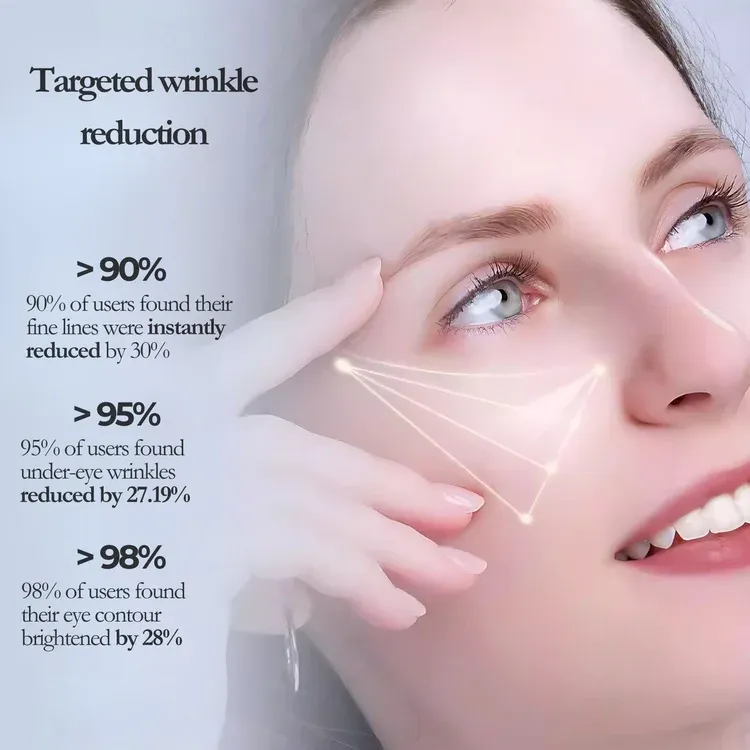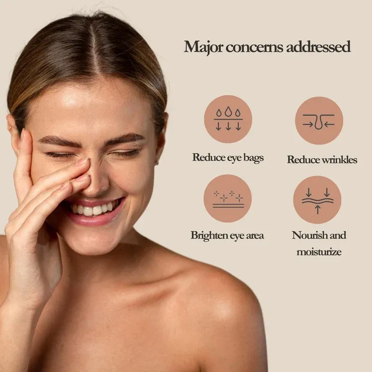 It brightens dark circles, reduces puffiness, smooths wrinkles, lifts sagging skin, and hydrates deeply, giving your under-eyes a refreshed, youthful glow in days.